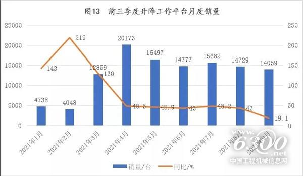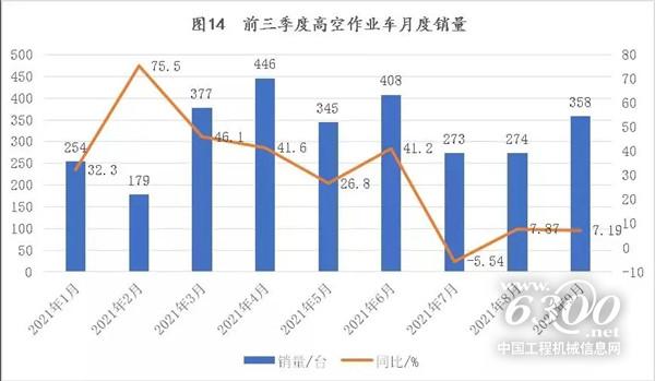 据中国工程机械工业协会的数据,2021年前三季度,我国工程机械行业经历了一季度销量高歌猛进,二季度、三季度逐渐下行的态势。升降工作平台和高空作业车销量如下。