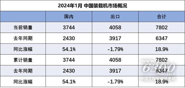 据中国工程机械工业协会对装载机主要制造企业统计,2024年1月销售各类装载机7802台,同比增长18.9%。其中国内市场销量3744台,同比增长54.1%;出口销量4058台,同比下降1.79%。2024年1月销售电动装载机370台( 3吨6台,5吨271台,6吨90台,7吨1台,8吨2台)。
