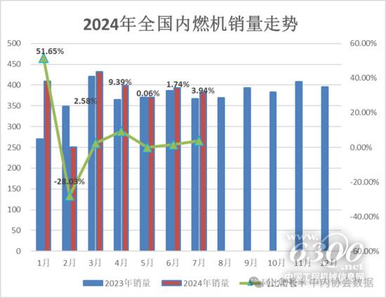 伴随设备更新和消费品以旧换新政策支持力度加大,进一步释放了存量市场换购需求,但由于7月的市场进入了传统的淡季,市场整体表现相对平淡,销量同比及累计同比只是小幅增长。具体表现为:7月内燃机销量381.33万台,环比增长-3.11%,同比增长3.94%;1-7月累计销量2635.07万台,同比增长4.31%(较1-6月涨幅减少0.05个百分点)。