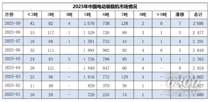 2025年9月销售电动装载机2586台(3吨以下41台,3吨82台,4吨4台,5吨1576台,6吨738台,7吨128台,8吨2台,8吨以上8台,滑移装载机7台)。