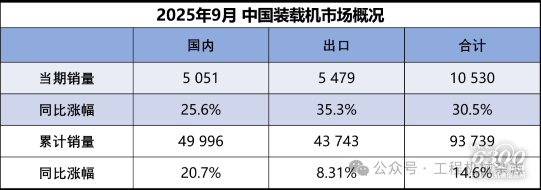 据中国工程机械工业协会对装载机主要制造企业统计,2025年9月销售各类装载机10530台,同比增长30.5%。其中国内销量5051台,同比增长25.6%;出口量5479台,同比增长35.3%。